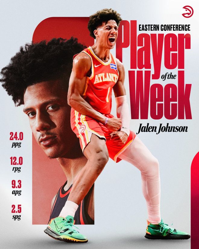 约翰森生涯首次成为周最佳球员。上周四场比赛,约翰逊场均上场34.8分钟,得到24.0分、12.0个篮板、9.3次助攻和2.5次抢断,投篮命中率60.3%、三分命中率57.1%、罚球命中率78.3%。他带领老鹰队完成西部客场四连胜,这是球队自1970-71赛季以来首次在至少四场的西部客场之旅中保持全胜。