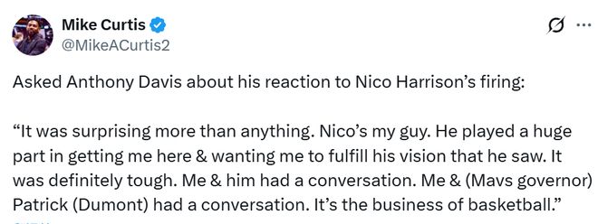 “最主要的感受是意外,”谈到总经理尼科-哈里森被炒时,浓眉说,“尼科是我很认可的人。显然,他在促成我加盟球队这件事上发挥了关键作用,也一直希望我能实现他所预见的愿景。这无疑是个艰难的结果……这就是篮球行业的常态。在与哈里森和杜蒙特分别沟通后,我得以专注于后续的康复训练,期待重返赛场、全力竞争。”